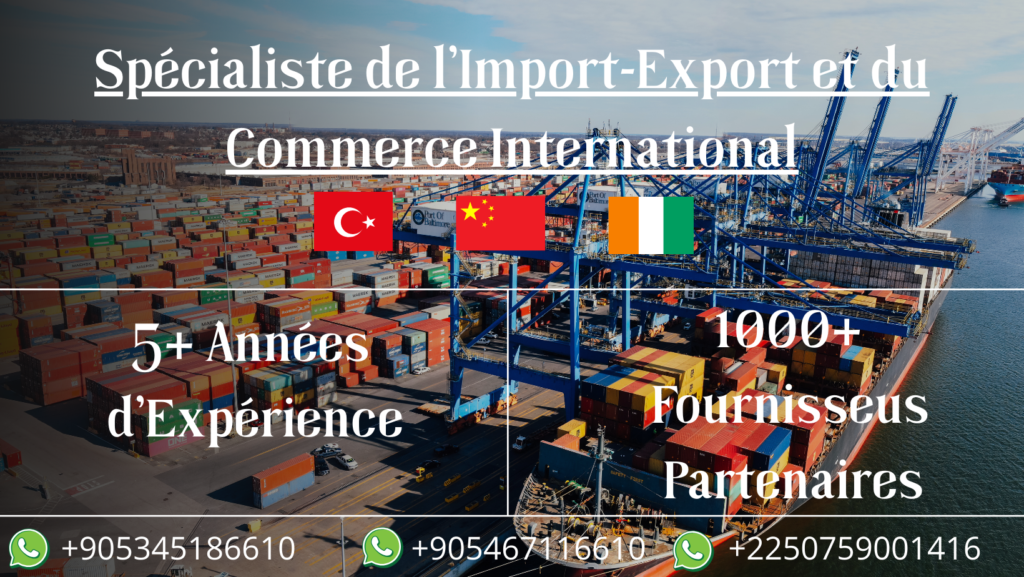 Nous opérons entre la Turquie, la Chine et la Côte d’Ivoire, en développant des solutions d’import-export fiables, structurées et sécurisées.